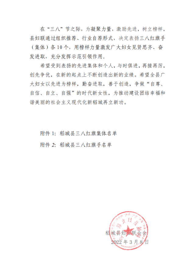 在第112个“三八”国际妇女节,为凝聚力量,激励先进,树立榜样,县妇联通过组织推荐、行业自荐形式,决定表扬三八红旗手 (集体)各 10 个,用榜样力量激发广大妇女见贤思齐、奋 发进取,充分发挥示范引领作用
